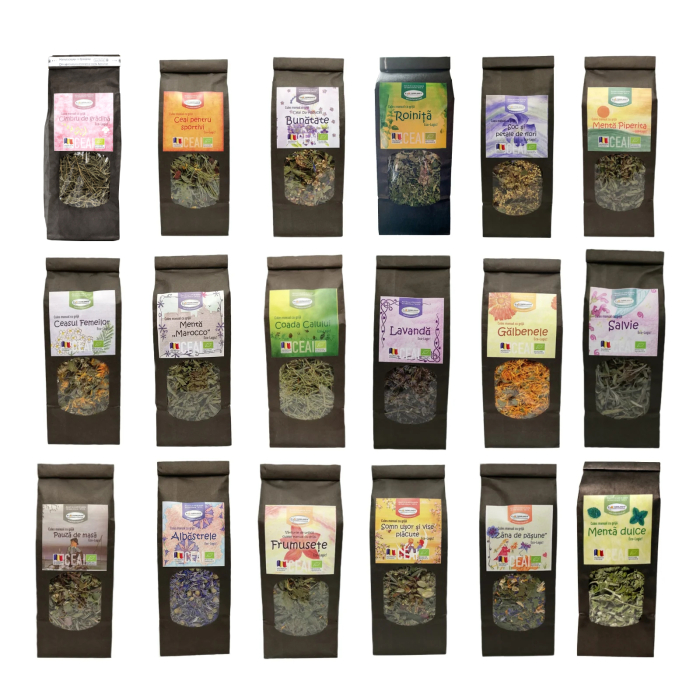 Descoperă Sortimentul ECOLOGIC 18 Ceaiuri - 720g, o colecție unică de ceaiuri BIO, atent selectate pentru a-ți oferi o călătorie aromatică prin natura românească.